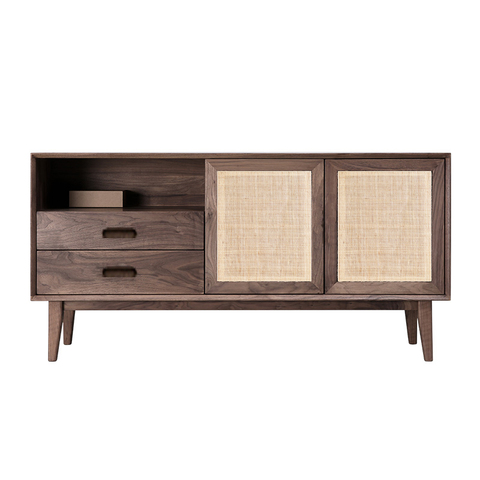モーデンウォールナットベニヤMDFテレビスタンド家具、杖籐ドア付き