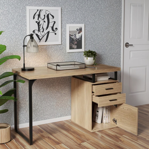 Bureau Effecti en chêne Table d'étude à pieds en métal avec 3 tiroirs offrant amplement d'espace pour un bureau d'ordinateur