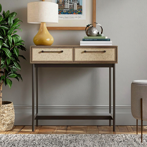โต๊ะคอนโซลอุตสาหกรรมแบบเรียบง่ายลิ้นชักหวายธรรมชาติสำหรับทางเข้าห้องนั่งเล่นโรงแรมโรงเรียนใช้-โซลูชันการจัดเก็บที่ทนทาน